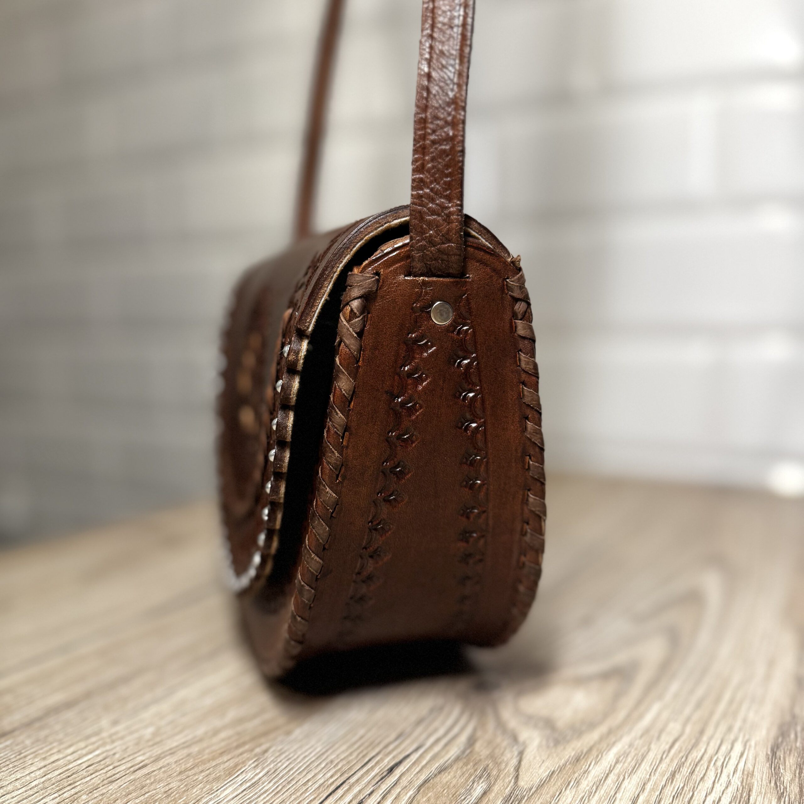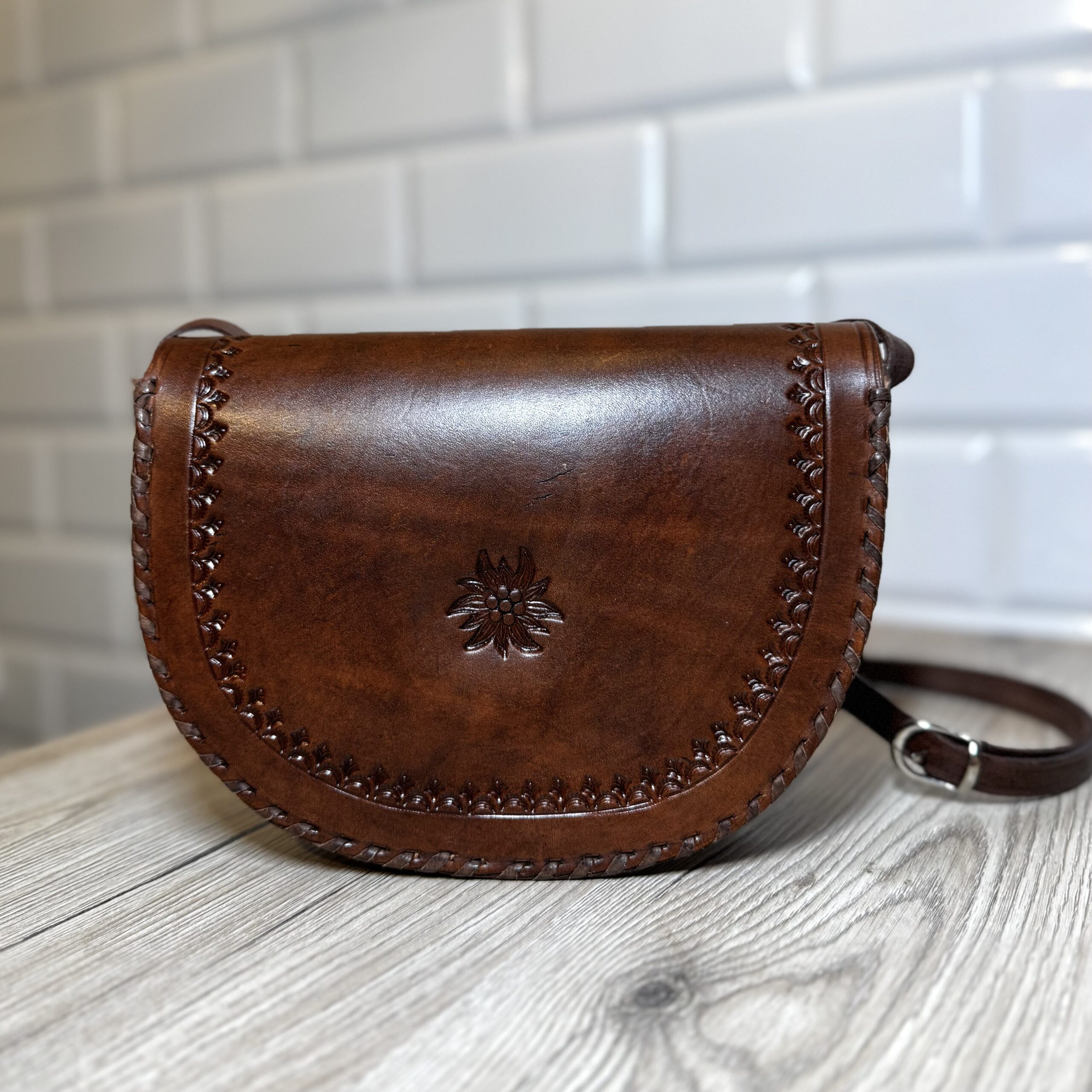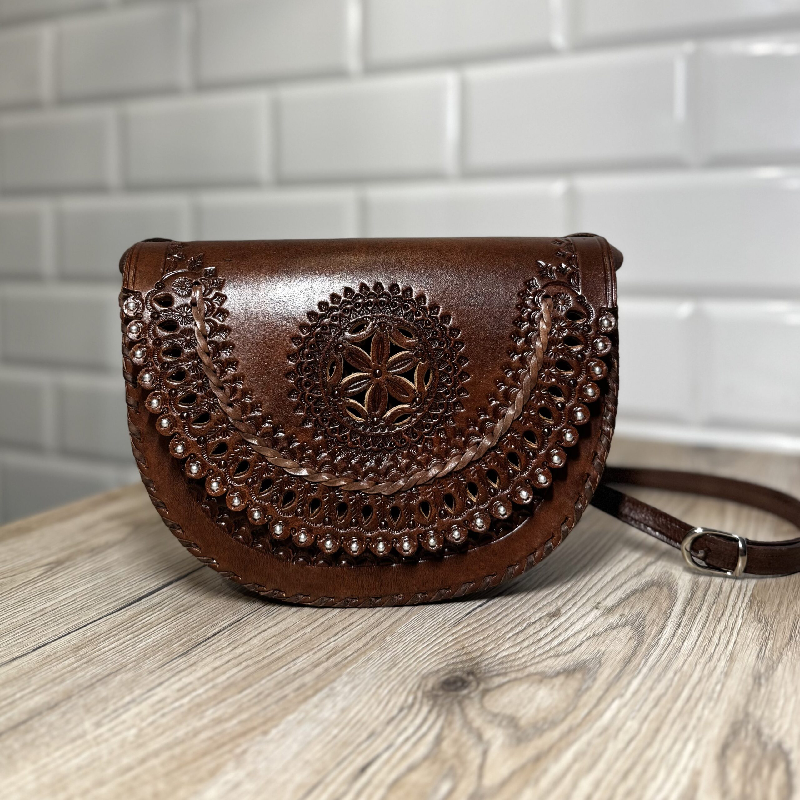 Ręcznie wykonana torebka z naturalnej juchtowej skóry licowej. Każdy egzemplarz powstaje od podstaw w naszej pracowni – od wybijania wzorów po szycie. Produkt regionalny, tworzony z dbałością o każdy detal.
